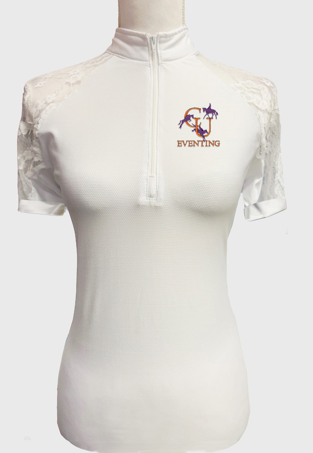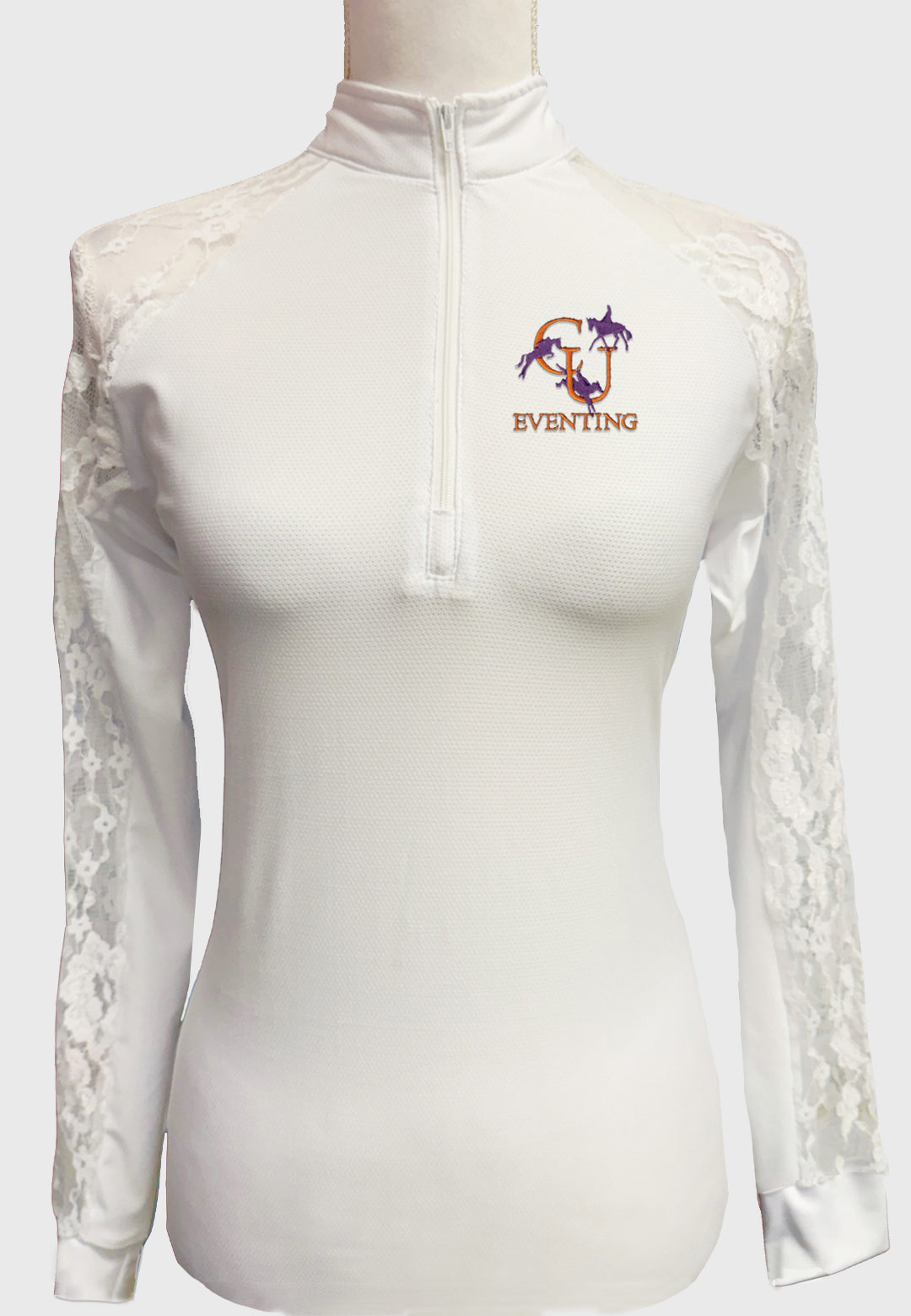 Our newest custom shirt design! Lovely solid color show shirt with full lace sleeves, with white zipper, collar and cuffs.