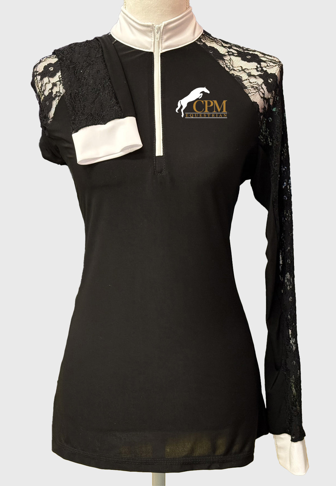 Our newest custom shirt design! Lovely solid color show shirt with full lace sleeves, with white zipper, collar and cuffs.