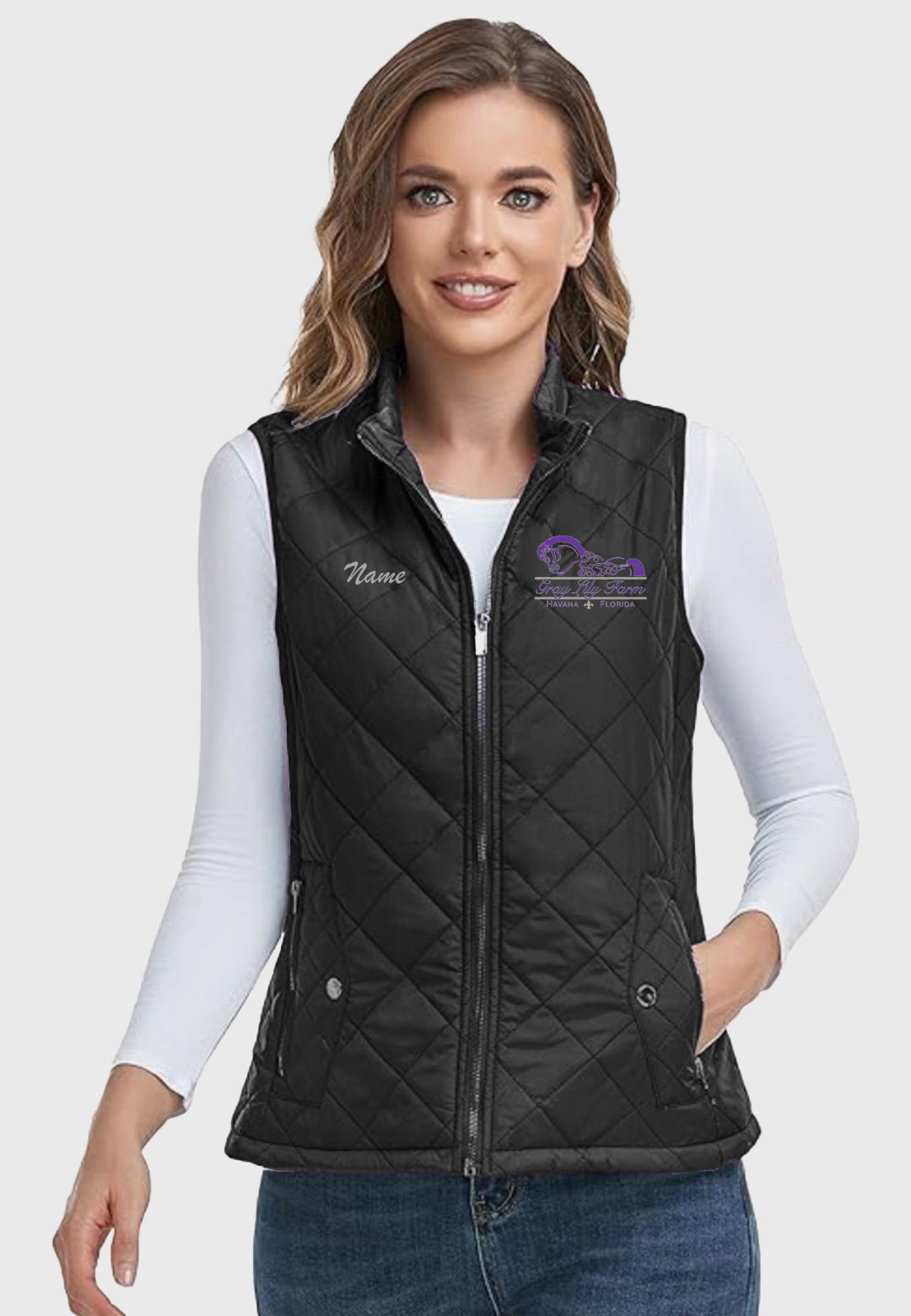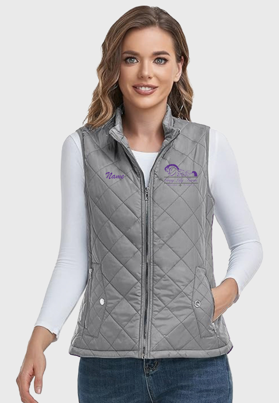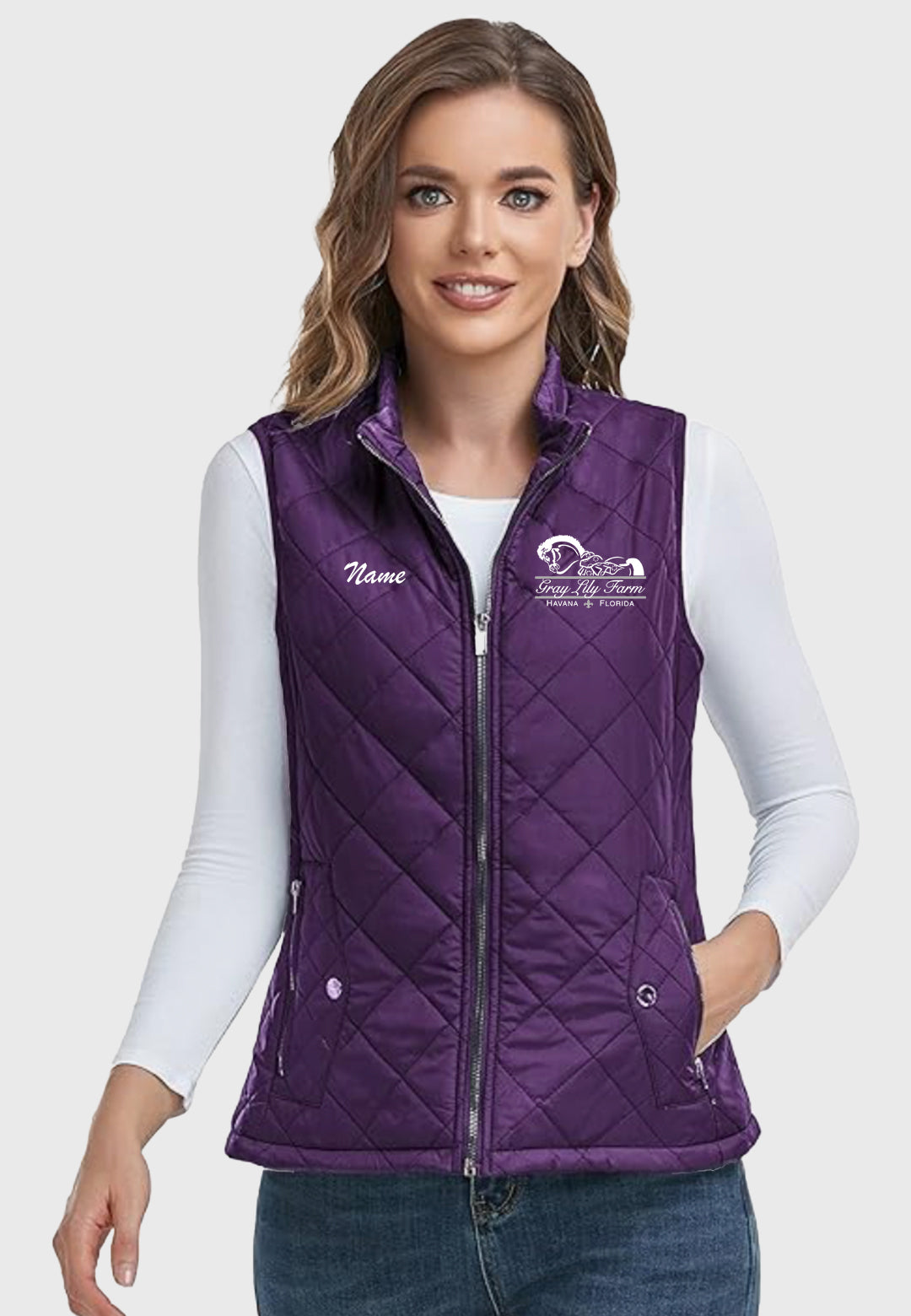 *Price includes embroidery on left chest, other choices are large back (+20) OR both (+$30) - grey lines/fleur de lis + white horse + verbiage on purple, OR light grey lines/fleur de lis + purple horse + verbiage on grey (grey might need to go darker on grey vest), optional name on front left chest for an additional $8 charge. We ask for 1 month to complete custom orders.