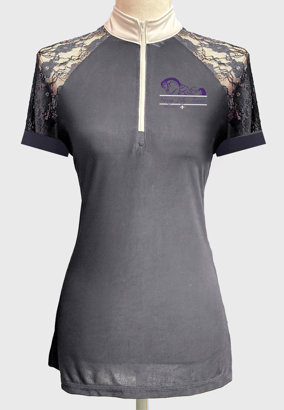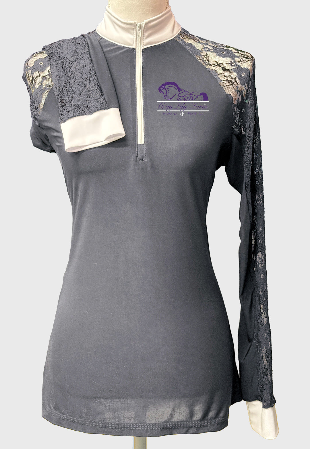 Our newest custom shirt design! Lovely solid color show shirt with full lace sleeves, with white zipper, collar and cuffs.