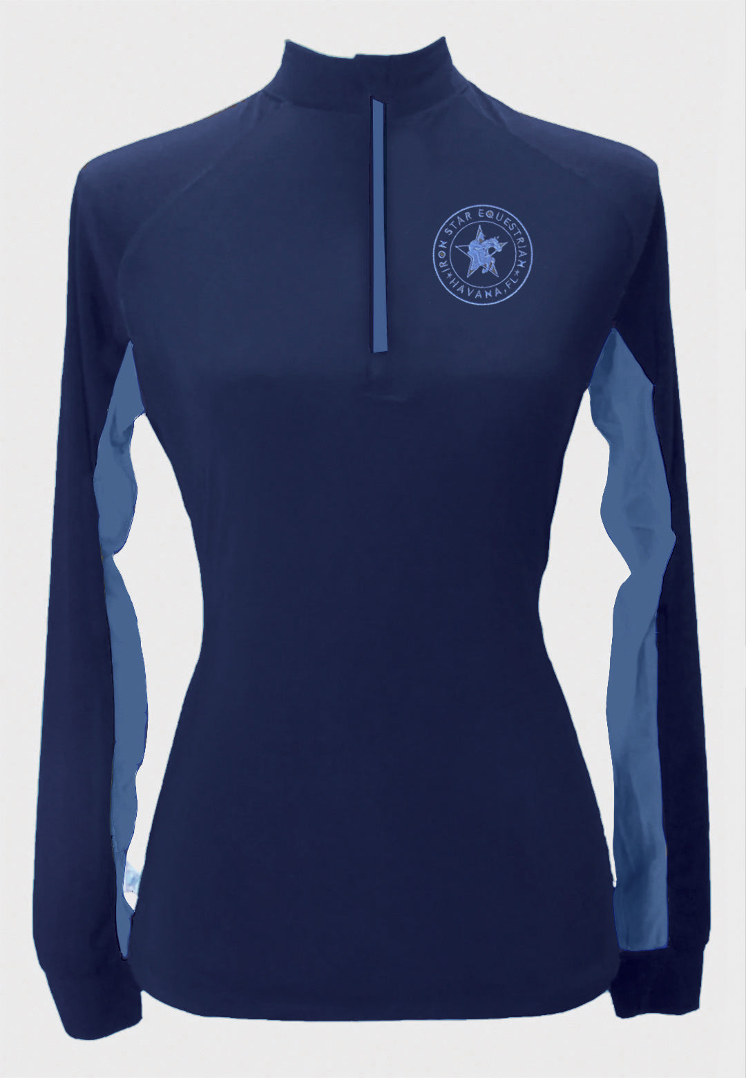 Design, create, wear! Our shirts are made from 95% Polyester and 5% Spandex. UPF 30 protection rating. Solid navy or black sun shirt with contrasting French blue vents + zipper.